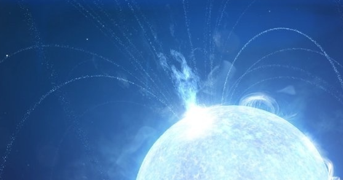我们宇宙最大星系有时有“小故障”——我们现在可能知道为什么了——“我们在量子力学和宇宙物理学间建立了一个强链接,这为中子星内部的自然情况研究提供了新视角”一幅插图显示一颗中子星“闪烁”,释放出一股无线