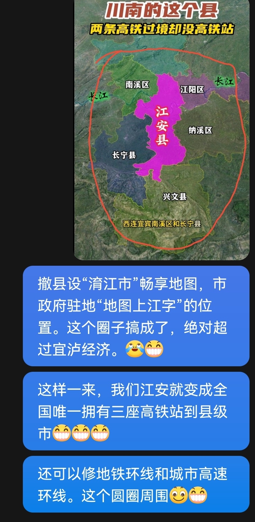 撤县设“淯江市”畅享地图,市政府驻地“地图上江字”的位置。这个圈子搞成了,绝对超过宜泸经济,城市类似于广东东莞市的经济发展格局。而且还能成为全国唯一拥有四座高铁站的县级市或者地级市!去他丫的宜宾泸州地