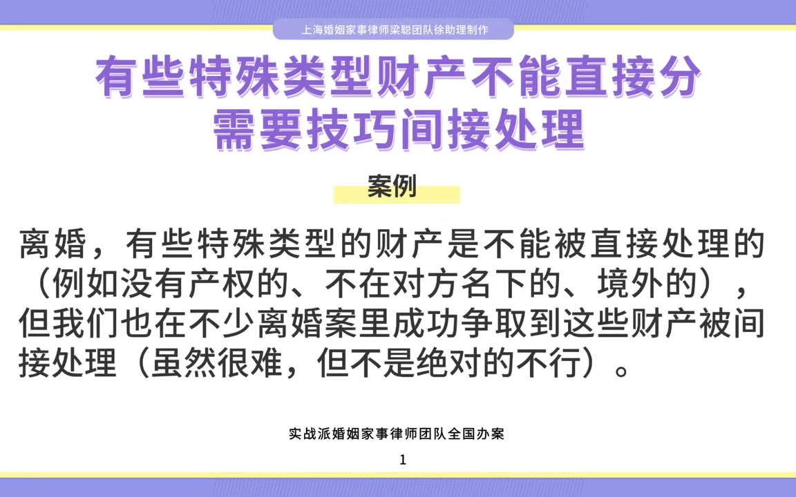 0次播放 | 00:12上海离婚律师梁聪团队原创:有些特殊类型财产不能直接分,需要技巧间接处理