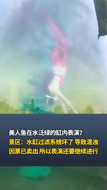 73次播放 | 00:12美人鱼在水泛绿的缸内表演? 景区:水缸过滤系统坏了 导致混浊 因票已卖出 所以表演还要继续进行