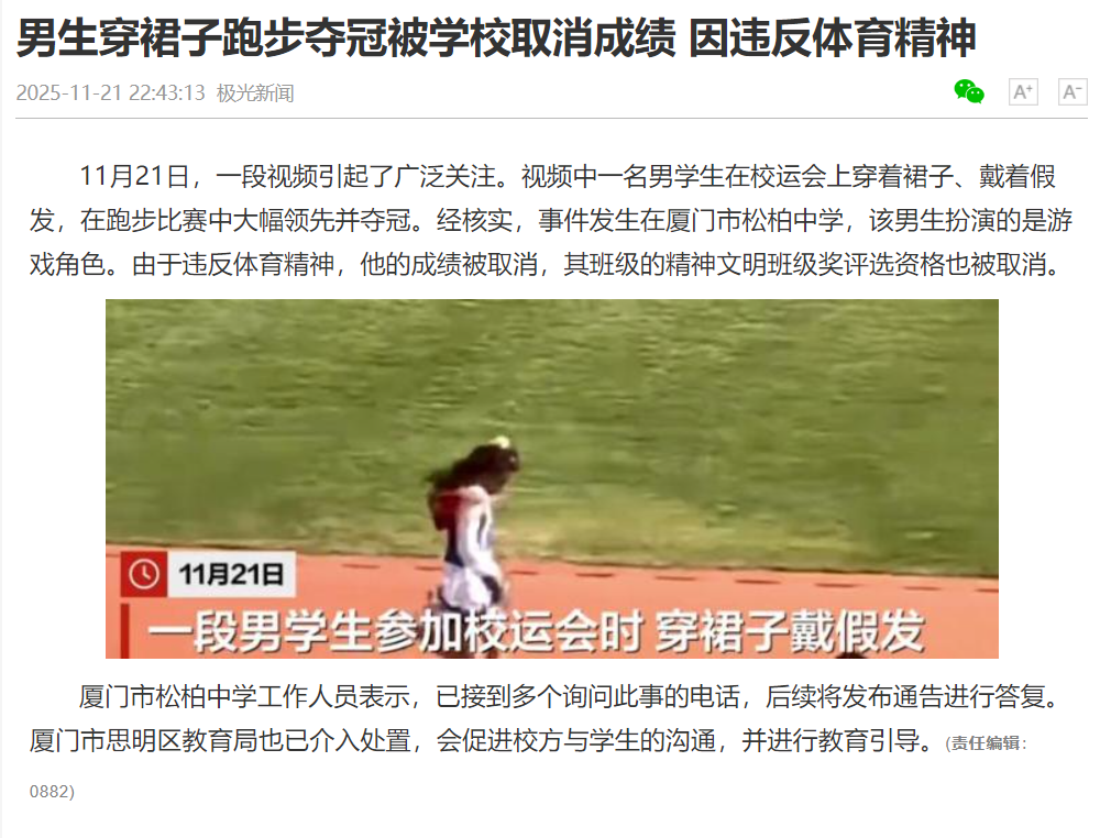 厦门一中学男生穿裙子戴假发跑步夺冠,学校取消成绩,教育局介入