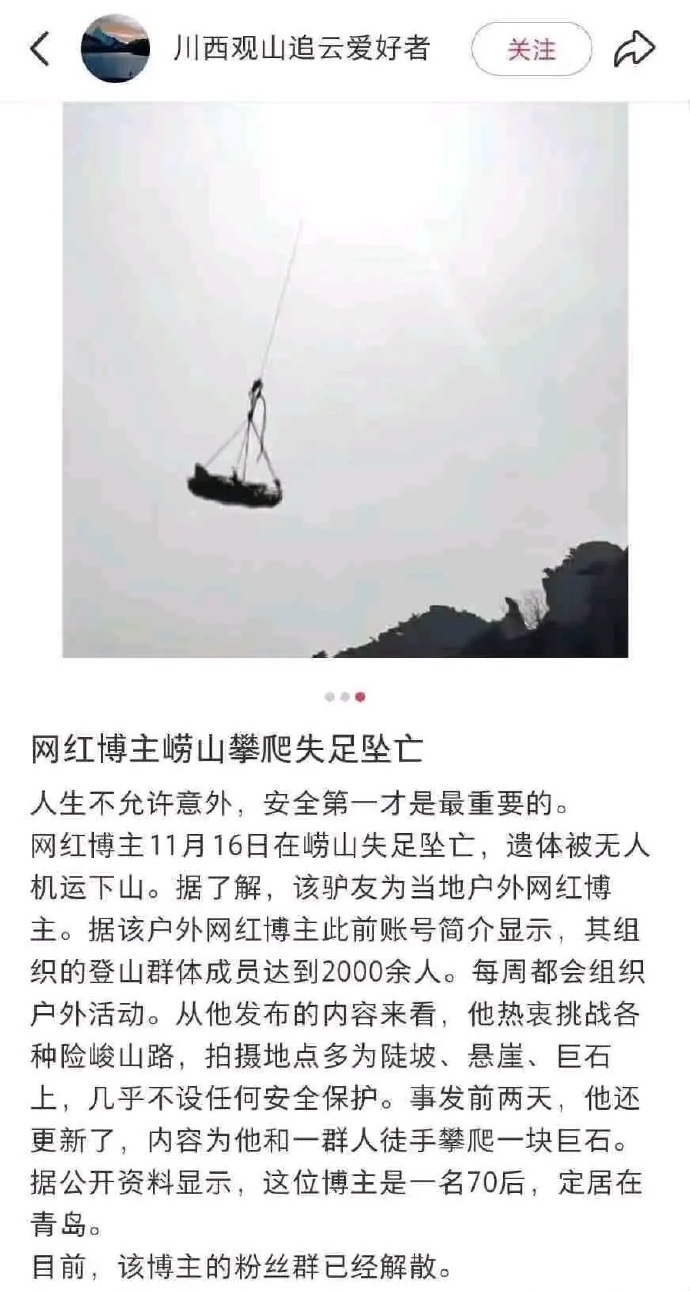 网红攀爬博主被网友说适合中午 果然死了