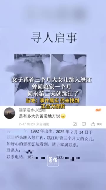 28次播放 | 03:28#女子背着三个月大女儿跳入怒江 曾回娘家一个月 回来第二天就跳江了 当地:事件属实 仍未找到 ...