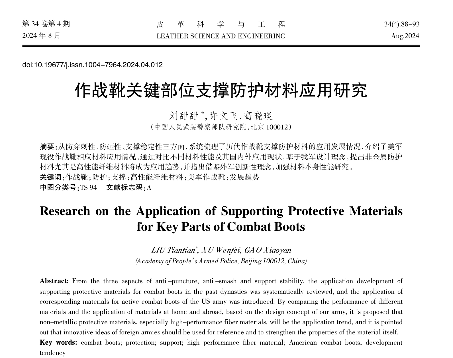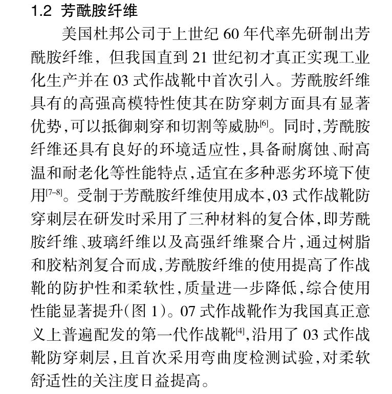 作战靴关键部位支撑防护材料应用研究刘甜甜*,许文飞,高晓琰(中国人民武装警察部队研究院,北京 100012)摘要:从防穿刺性、防砸性、支撑稳定性三方面,系统梳理了历代作战靴支撑防护材料的应用发展情况,