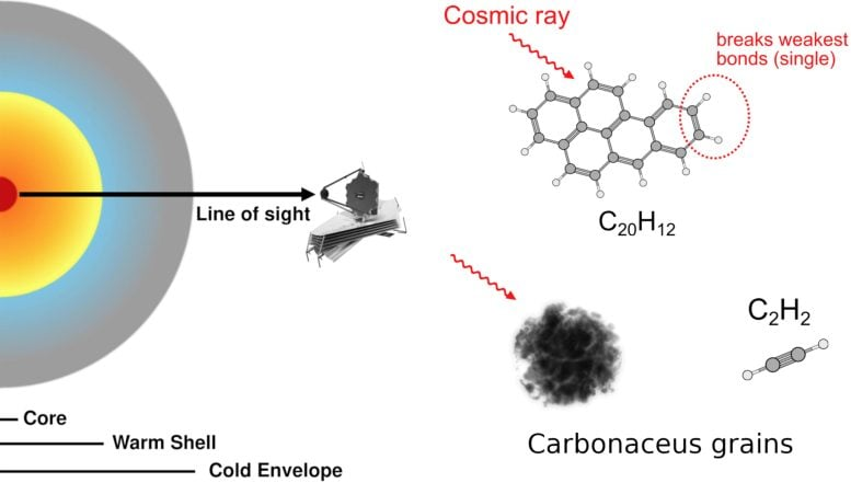 一个被尘埃遮蔽的星系核被发现竟是一座异常活跃的化学工厂,宇宙射线可能正在驱动关键有机分子的生成。詹姆斯韦布空间望远镜艺术构想图。来源:美国国家航空航天局戈达德太空飞行中心,阿德里安娜M古铁雷斯(CI实