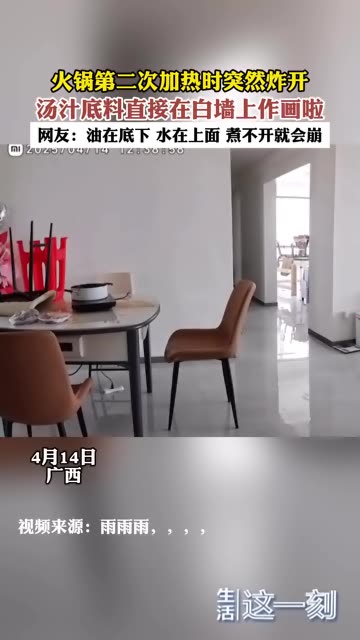 火锅第二次加热时突然炸开 汤汁底料直接在白墙上作画啦 网友:油在底下 水在上面 煮不开就会崩