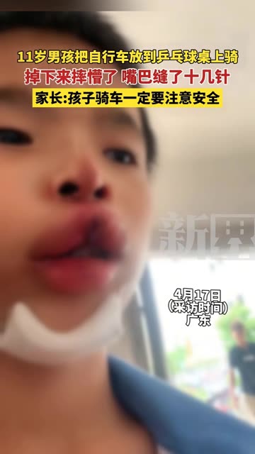 4月18日,广东(原创采访),11岁男孩把自行车放到乒乓球桌上骑,掉下来直接摔懵了,嘴巴缝了十...