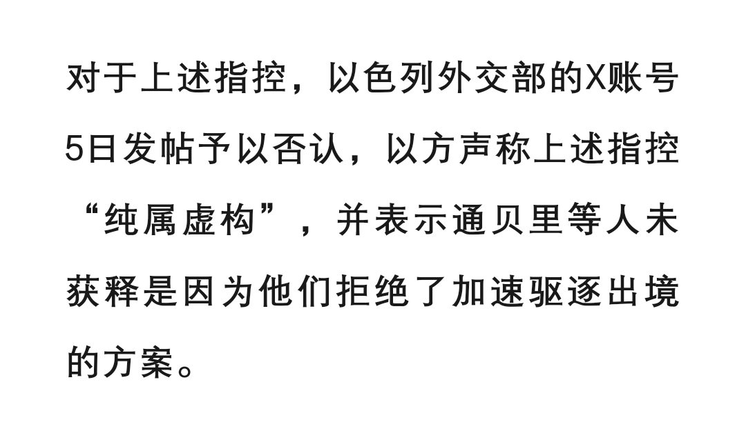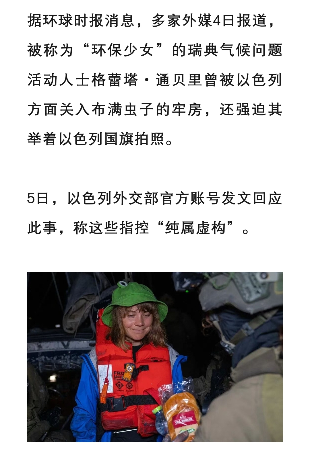 以色列外交部发表声明,称瑞典环保少女通贝里被以军虐待的事情“纯属虚构的无耻谎言”。声明里还说,是通贝里自己拒绝获释,并自己要求延长拘押。