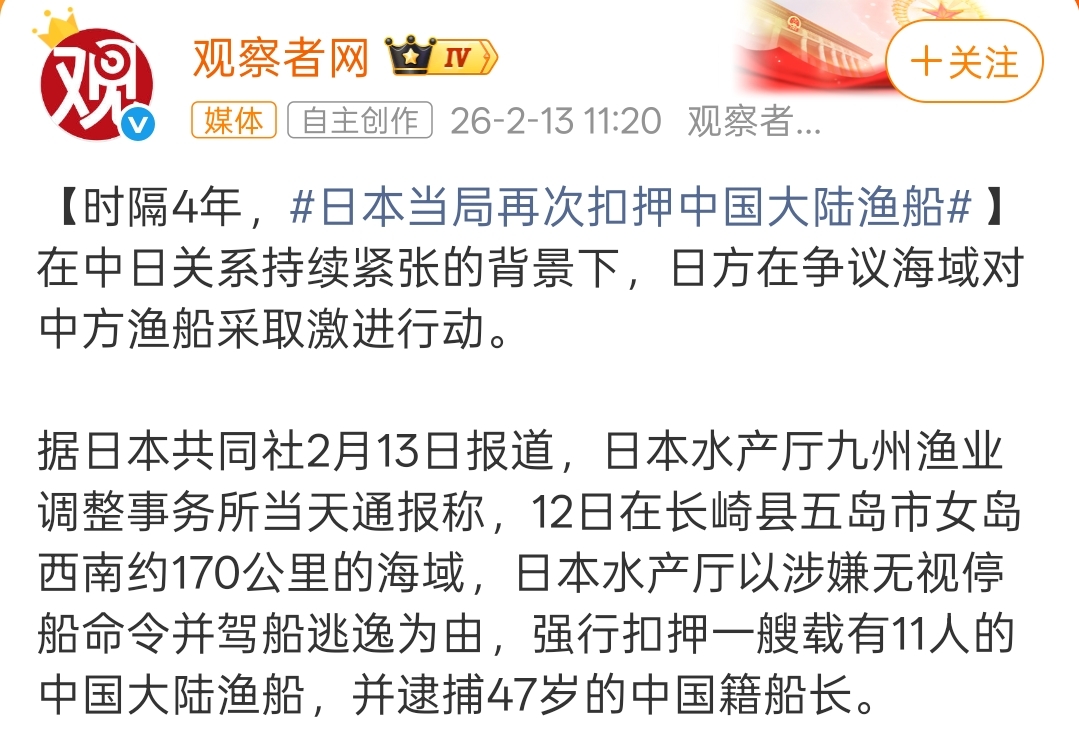 倭奴当局再次扣押中国大陆渔船