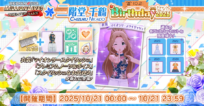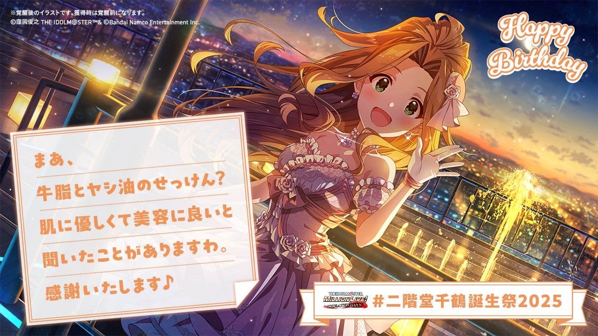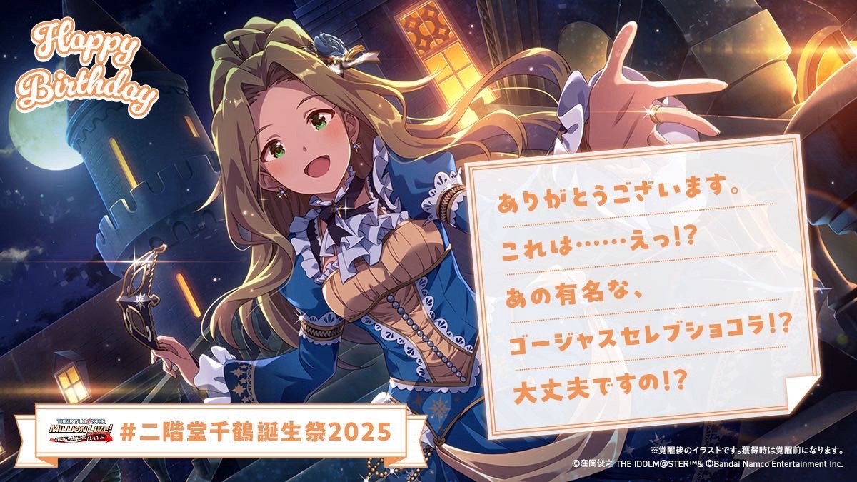今天是二階堂千鶴的生日哦!剧场的白板上,写下了あずさ、昴、環、可憐还有麗花的祝福!生日套装正在发售中,生日卡池同时也正在举行,不要错过哦~