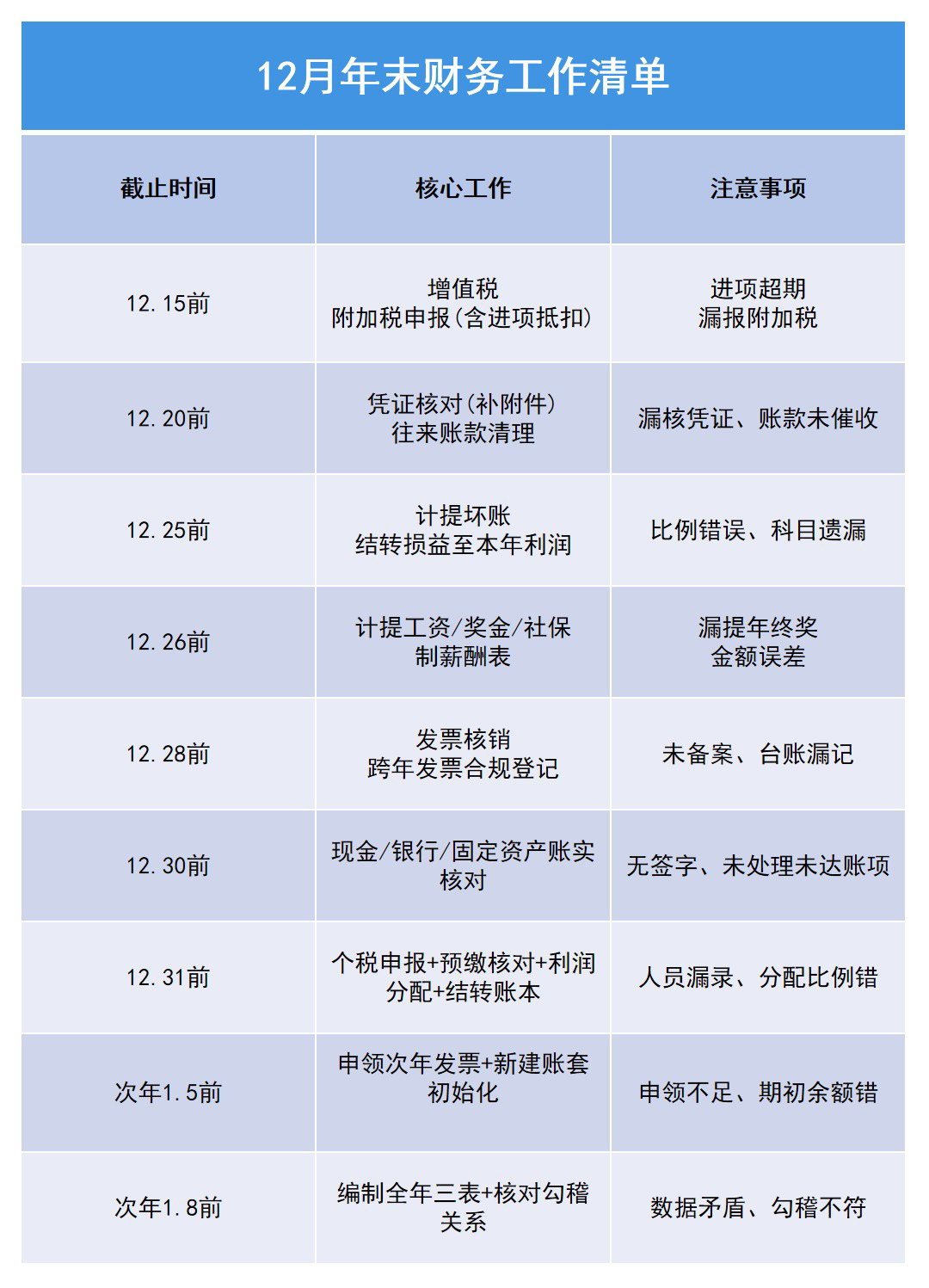 财务人12月究竟有多忙?这些事情不做完,年都过不踏实!年底冲业绩的是业务,忙到脚不沾地的是会计!12月这11项核心工作,每一件都不能含糊: 1. 核全年往来账:导出应收/应付明细账,对着合同、回款/付