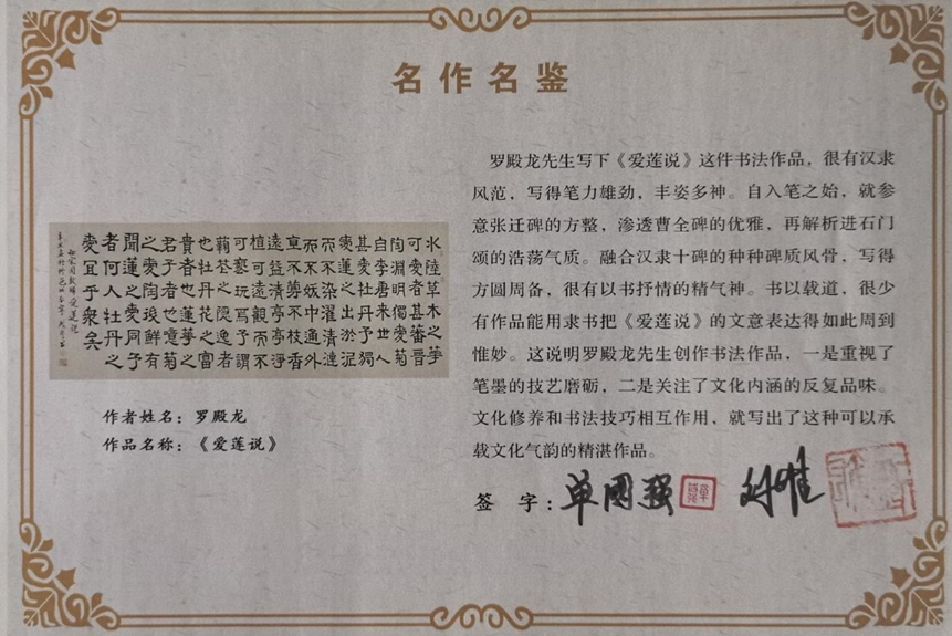 艺术家简介: 罗殿龙,广西壮族自治区高级人民法院原党组书记、院长,二级 大法官,广西大学法学院兼职教授、硕士研究生导师。 广西大学校友文化研究院院长,广西书法院名誉院长,中国书法家协会会员,中国硬笔