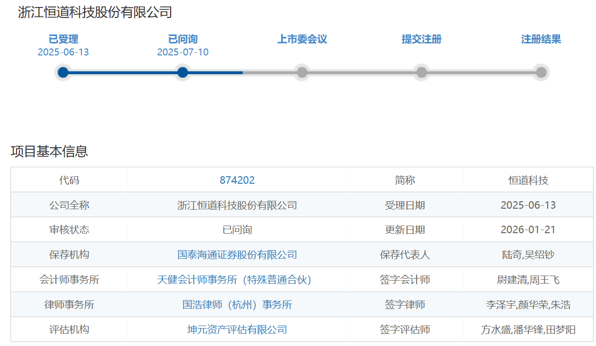 《港湾商业观察》施子夫1月28日,北交所将召开2026年第9次上市委审议会议,届时将审议浙江恒道科技股份有限公司(以下简称,恒道科技)的首发上会事项。此次IPO,恒道科技计划将募集4.03亿元资金,其