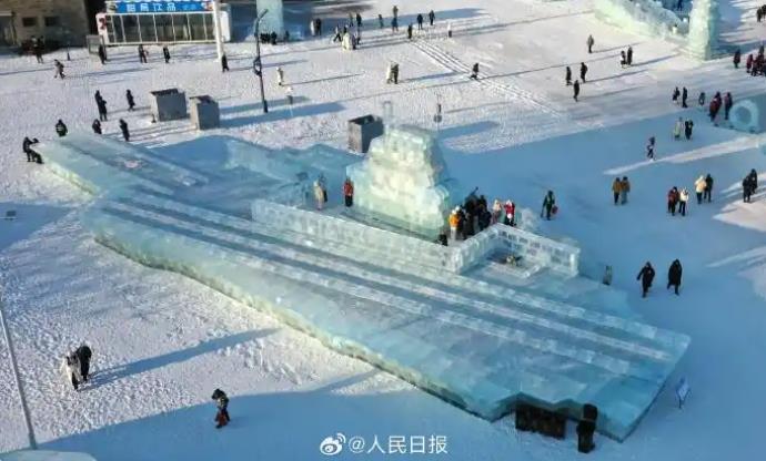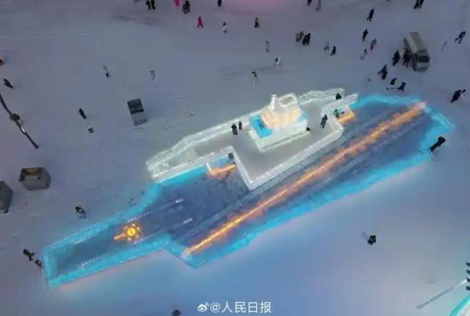 壮观!2000立方冰块雕成福建舰,见证哈尔滨从冰雪之都升级为文化表达者的蜕变!