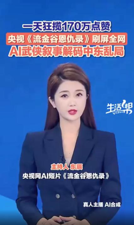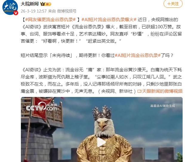3月20日消息,央视网今日上线的AI短片《流金谷恩仇录》爆火,截至发稿,点赞195万次、评论16.3万条、转发155万次,不少看完的网友直言做得太好了,秒懂目前中东局势,同时还有非常多的人在线催更。整