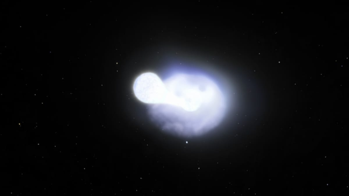 天文学家首次观测到磁星的诞生过程。艺术家构想图:一颗磁星被一个因广义相对论效应而发生进动(即摆动)的吸积盘所环绕。部分磁星理论模型指出,沿磁星自转轴方向会喷发出高速带电粒子流。这类天体形成于大质量恒星