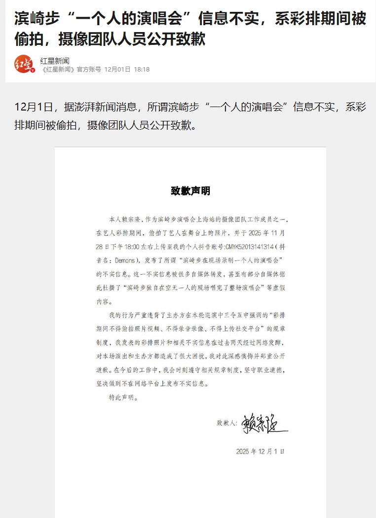 据澎湃新闻报道:所谓滨崎步“一个人的演唱会”信息不实,系彩排期间被偷拍,摄像团队人员公开致歉。 @烟火濒海 :本人赖宗隆,作为滨崎步演唱会上海站的摄像团队工作成员之一,在艺人彩排期间,