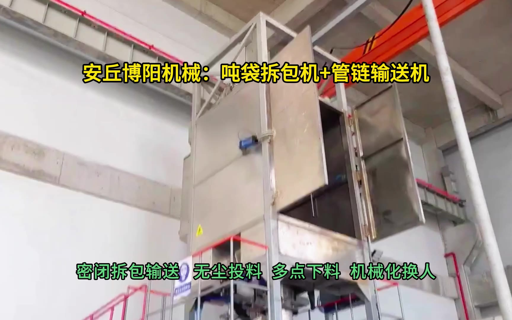 0次播放 | 00:30安丘博阳机械化工粉料吨袋无尘拆包机+多点出料管链输送机动画演示原理