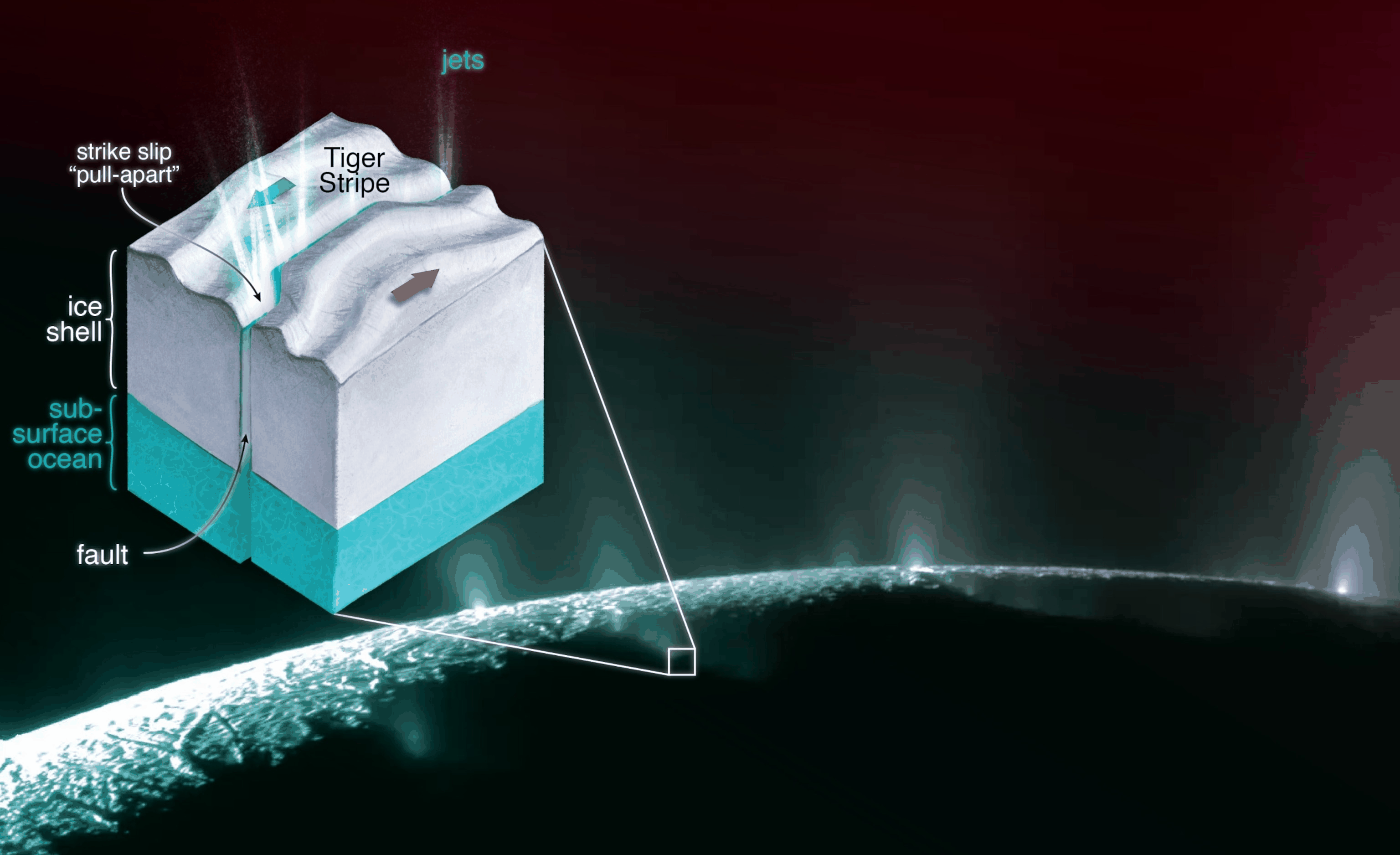 土卫二南极地区爆发出羽状物。图片来源:NASA/JPL-Caltech通过新的实验,日本和德国的研究人员重现了土卫二地下海洋中的化学条件。发表在《Icarus》杂志上的研究结果表明,这些条件可以很容易