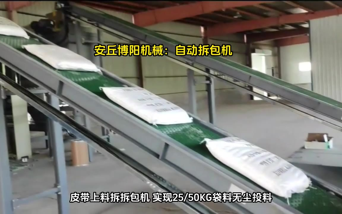 0次播放 | 00:27预混饲料自动拆袋机 25kg饲料原料自动拆包机厂家