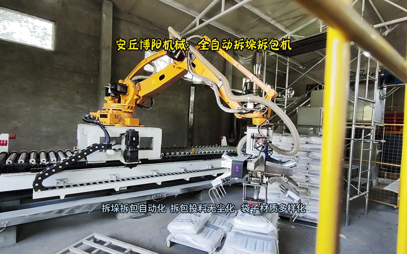0次播放 | 00:19山东氧化钙自动拆包机械手 粉体全自动拆垛拆包机器人