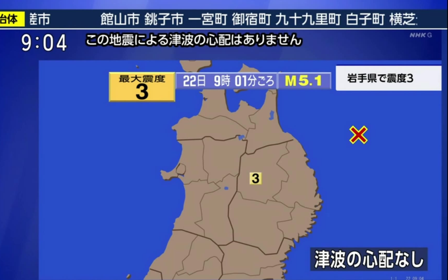 30次播放 | 01:12【地震速报 NHK G 最大震度3】青森县东方沖 M5.1 震源深度10km 2026.04.22