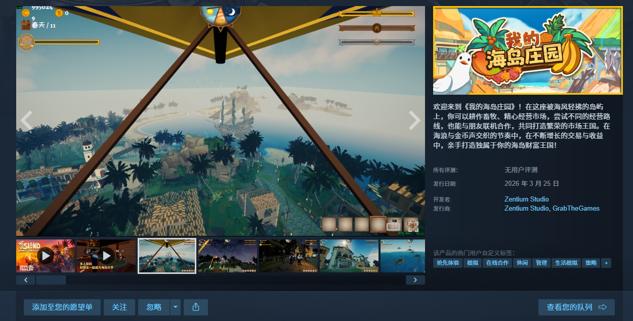 由Zentium Studio开发、GrabTheGames发行的海岛经营模拟游戏《我的海岛庄园》将于2026年3月25日在Steam平台正式推出抢先体验版。本作是一款以热带海岛为舞台的模拟经营游戏。