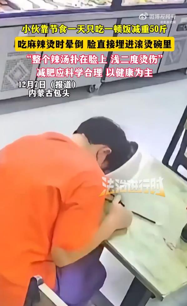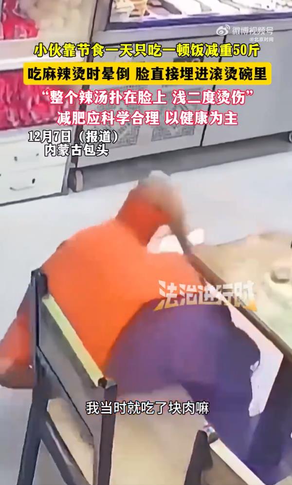 内蒙古包头一名20多岁的理发师武先生,靠每天只吃一顿饭,在9个月内减重50斤。体重从200斤降至150斤的他,本以为完成了“逆袭”,却在一次吃麻辣烫时突然晕倒,面部跌入滚烫汤碗,造成浅二度烫伤。所幸眼