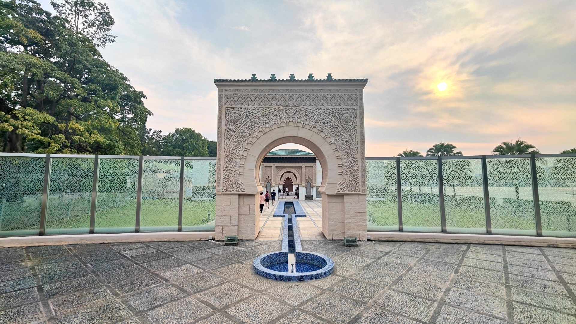 该建筑坐落于布城第一区植物园东南隅,占地约0.4公顷,由摩洛哥派遣匠人历时两年纯手工修筑,设计原型深度复刻了马拉喀什(Marrakesh)与非斯(Fez)的王室宫殿。立面由摩洛哥粘土与碎石压制的浅赭色