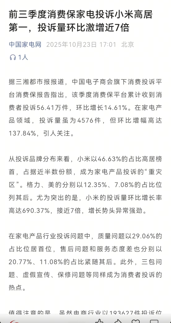小米前三季度消费保家电投诉高居第一,投诉量环比激增近7倍