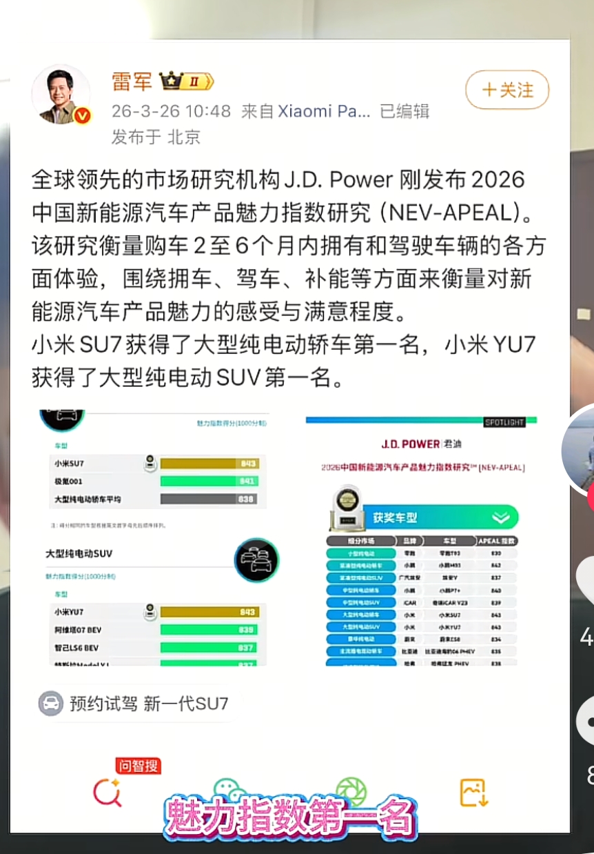 共5张恭喜小米SU7和小米YU7获得魅力指数研究第一名