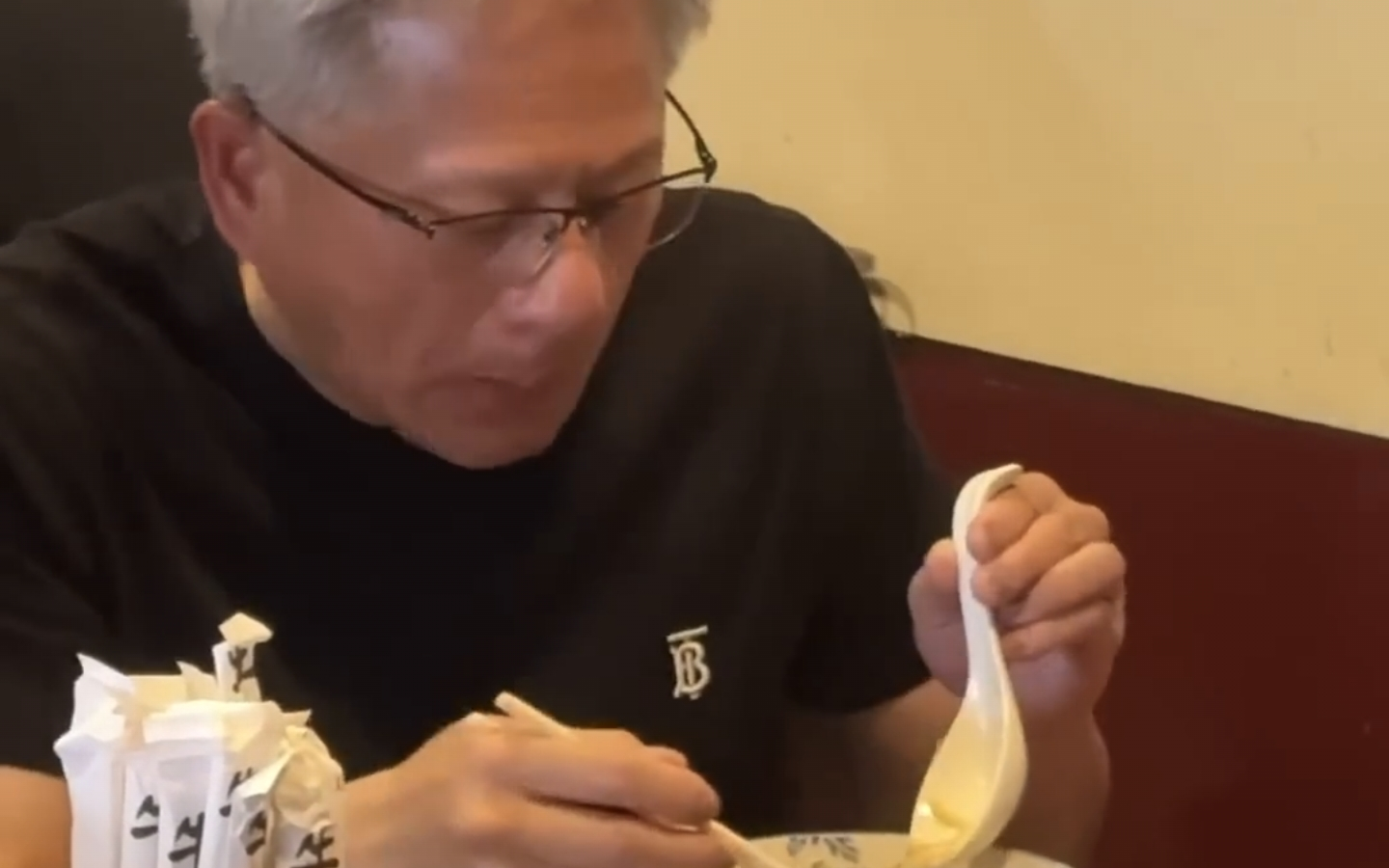 万亿富豪辉达黄老板真的超爱吃台北牛耳家面条。看那陶醉的小表情!