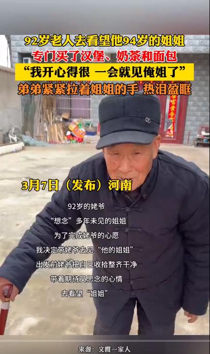 近日,河南发生了一件让人心里暖洋洋的事儿。一位92岁的老爷爷,因为太想念自己94岁的姐姐,特地让晚辈开车带他去看望。老爷爷出门前还特意换了身干净又正式的衣服,显得特别重视这次见面。原来,老爷爷上次吃了