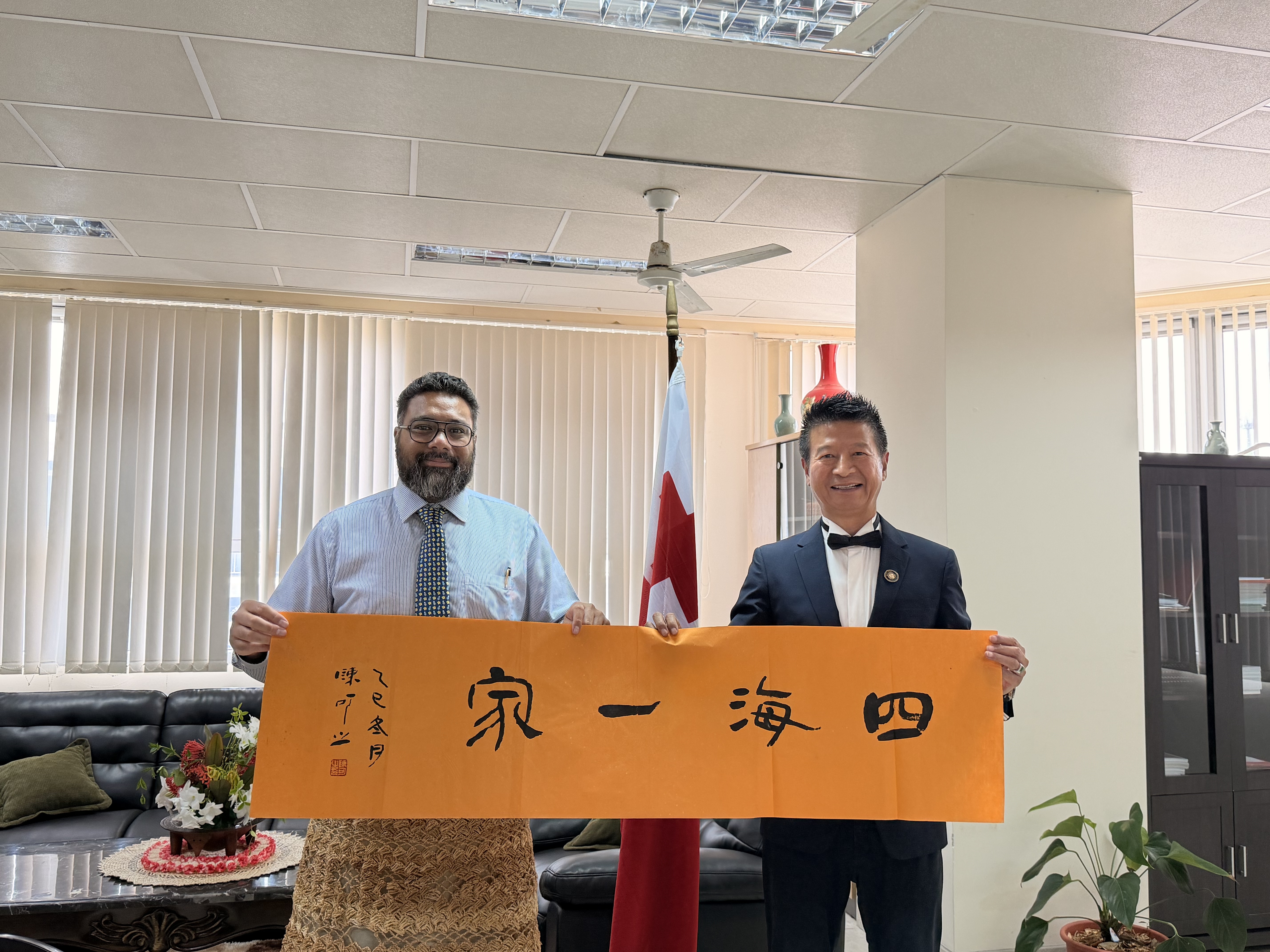 近日,汤 近日,汤加王国首相法卡法努阿收到了一份来自中华人民共和国特使的珍贵礼物——中国著名艺术家陈可之先生的书法作品“四海一家”。这一文化外交往来不仅传递了中汤两国深厚的友谊,也展示了中国传统文化