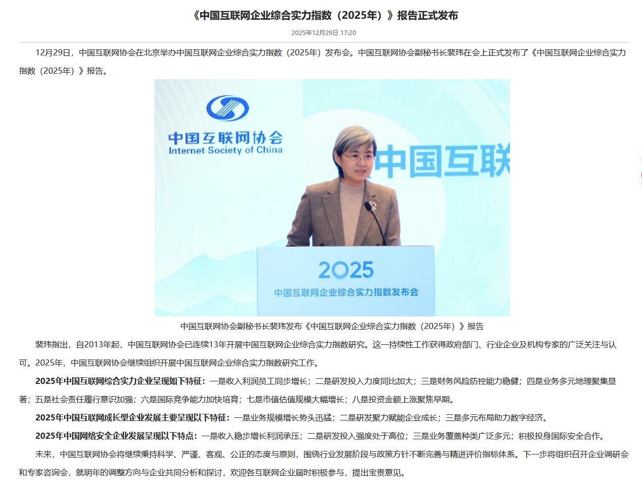 《中国互联网企业综合实力指数(2025年)》报告正式发布