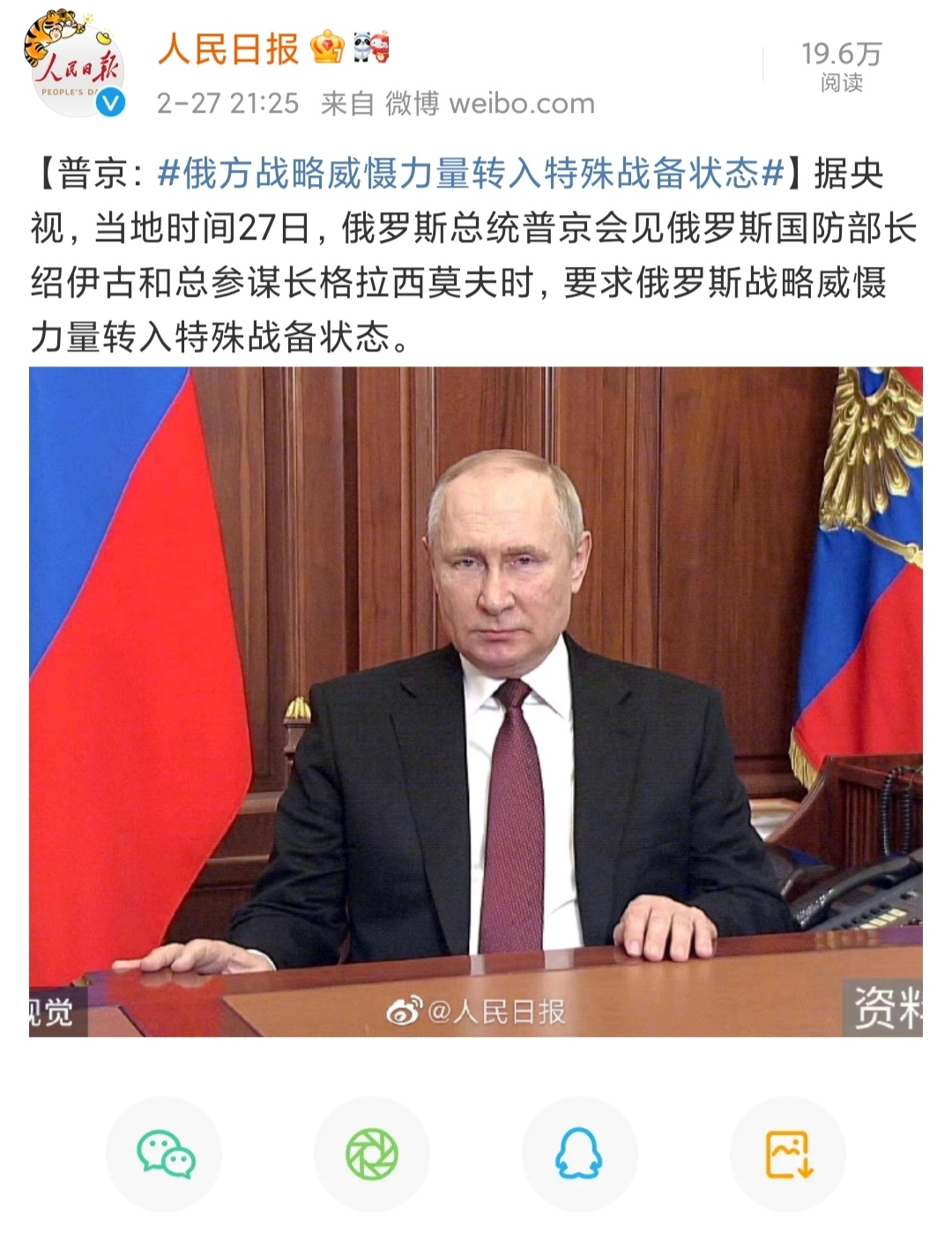 据央视,当地时间27日,俄罗斯总统普京会见俄罗斯国防部长绍伊古和总参谋长格拉西莫夫时,要求俄罗斯战略威慑力量转入特殊战备状态。 来源:人民日报