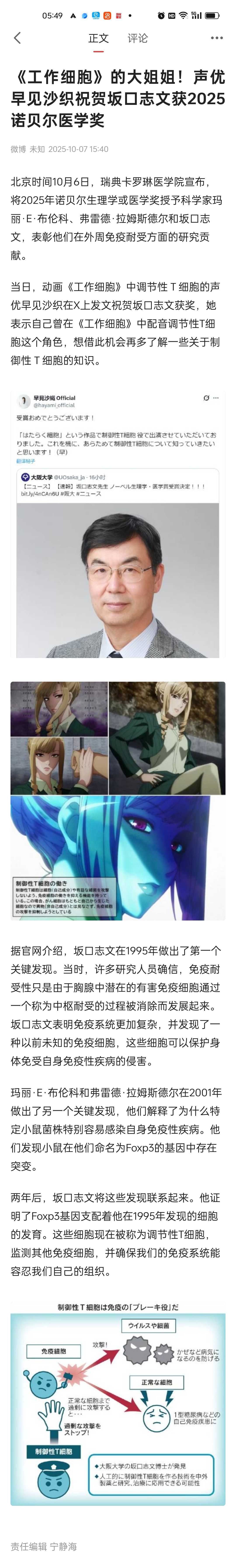 《工作细胞》的大姐姐!声优早见沙织祝贺坂口志文获2025诺贝尔医学奖