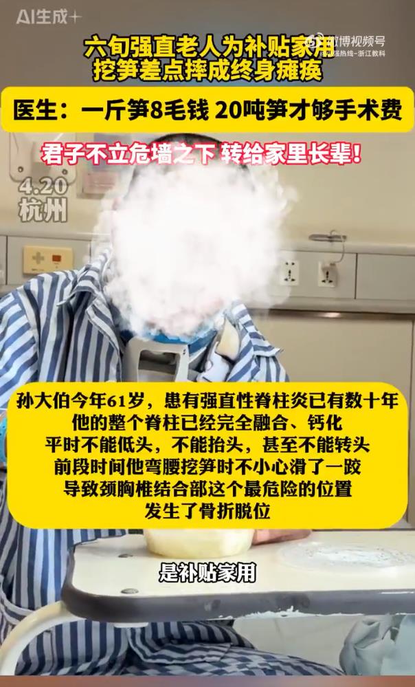 家人们,4月20号在杭州发生了一件让人揪心又带点无奈的事儿。61岁的孙大伯,患强直性脊柱炎已经好几十年了,这病把他的脊柱折磨得融合钙化了,整个人就像一根硬邦邦的木棍,头都没法正常低、抬,连转个头都费劲