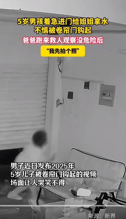 江苏常州一男子近日发布5岁儿子2025年被卷帘门钩起的视频,让人哭笑不得。当事人孩子爸爸刘先生表示:他姐姐赶着去跳舞想喝水,他着急钻进车库拿水,不慎被卷帘门钩起挂在半空,卷帘门有自动限位,不会把孩子卷