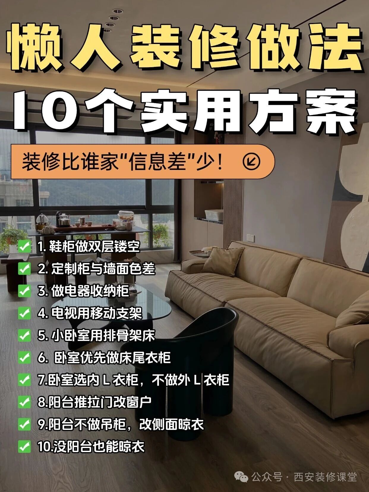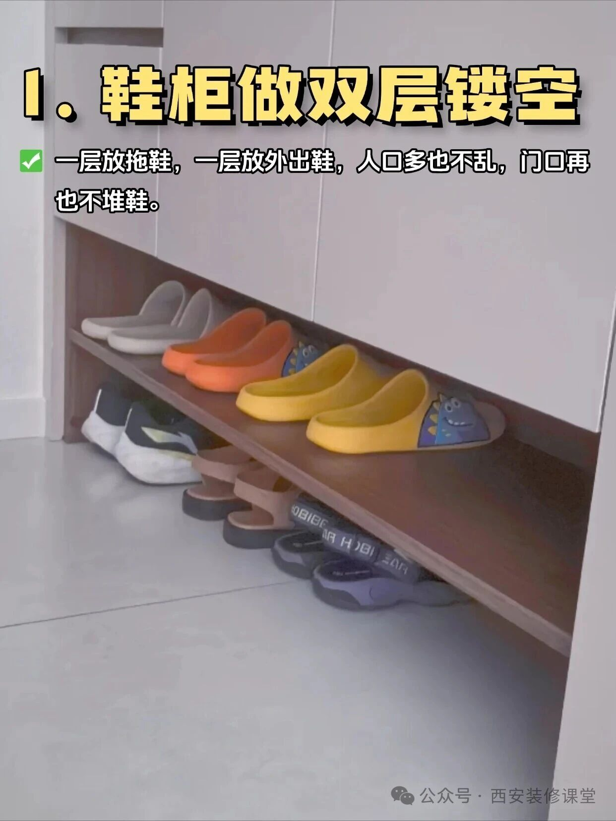 懒人装修看这篇!10个实用设计,照着装就行装修不想费脑子?这 10 个设计简单又好用,照着装错不了!𝟭.鞋柜做双层镂空 做成双层设计,一层专门放拖鞋,一层放出门穿的鞋。️𝟮.定制柜与墙面色差不用愁