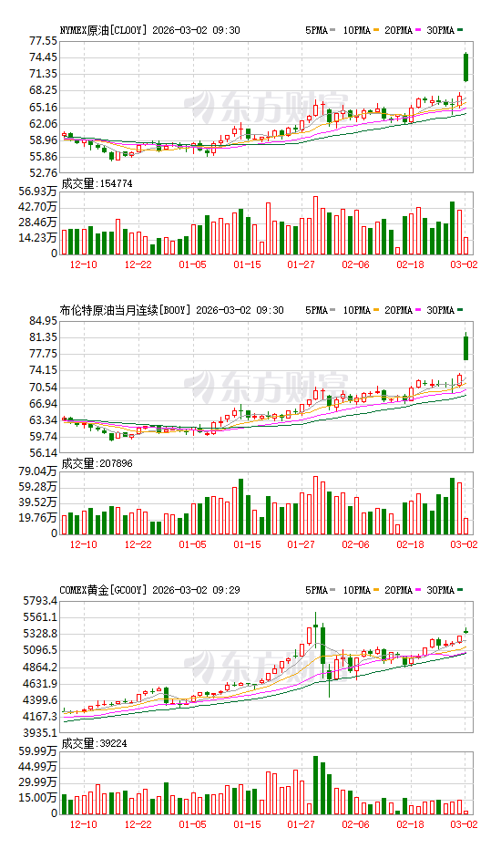 在美国和以色列袭击伊朗后,国际油价跳涨,截至发稿,WTI原油期货大涨10%,布伦特原油开盘飙升13%;黄金开盘上涨1.6%。美股期货低开,道指期货跌1.0%,纳斯达克指数期货跌1.20%,标普500指