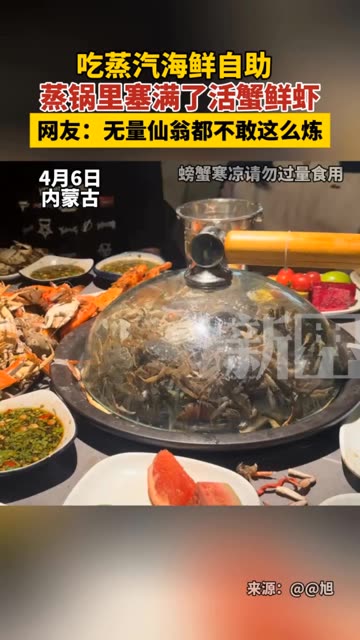 网友吃蒸汽海鲜自助,蒸锅里塞满了活蟹鲜虾。