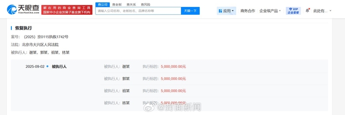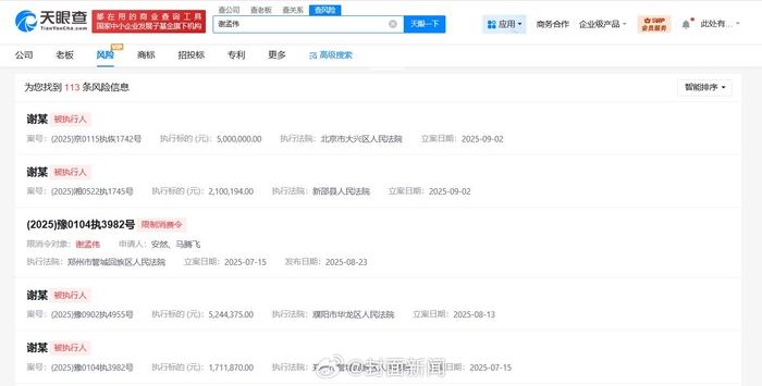 【#嘎子谢孟伟被限制高消费##谢孟伟新增2条被执行人信息#】天眼查App显示,近期,谢孟伟(嘎子哥)新增2条被执行人信息,执行标的合计710万余元,被执行人还包括郭珊珊(谢孟伟妻子)等,执行法院为北京