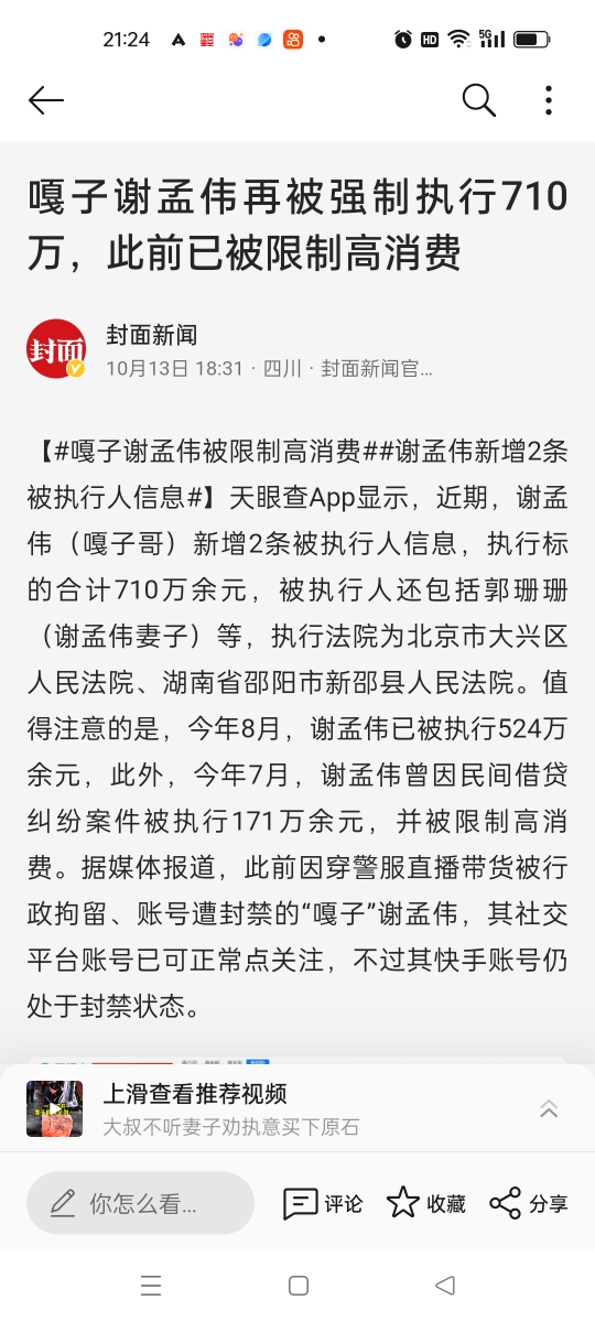 嘎子谢孟伟再被强制执行710万,此前已被限制高消费