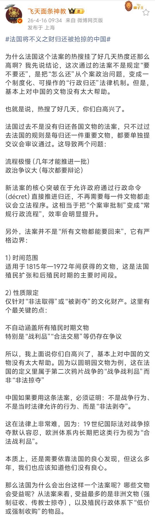 来源:观察者网4月13日,法国国民议会罕见地以170票赞成、0票反对,全票通过一项法案,将简化法国在殖民时期掠夺所得文物的归还程序。本次会议出席议员占总数的三分之一,尽管法国各政党对法案细节存在分歧,