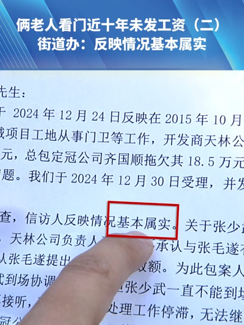 0次播放 | 01:07俩老人看门近十年未发工资。街道办:反映情况基本属实。公司:要工资没手续,我们不欠他钱。