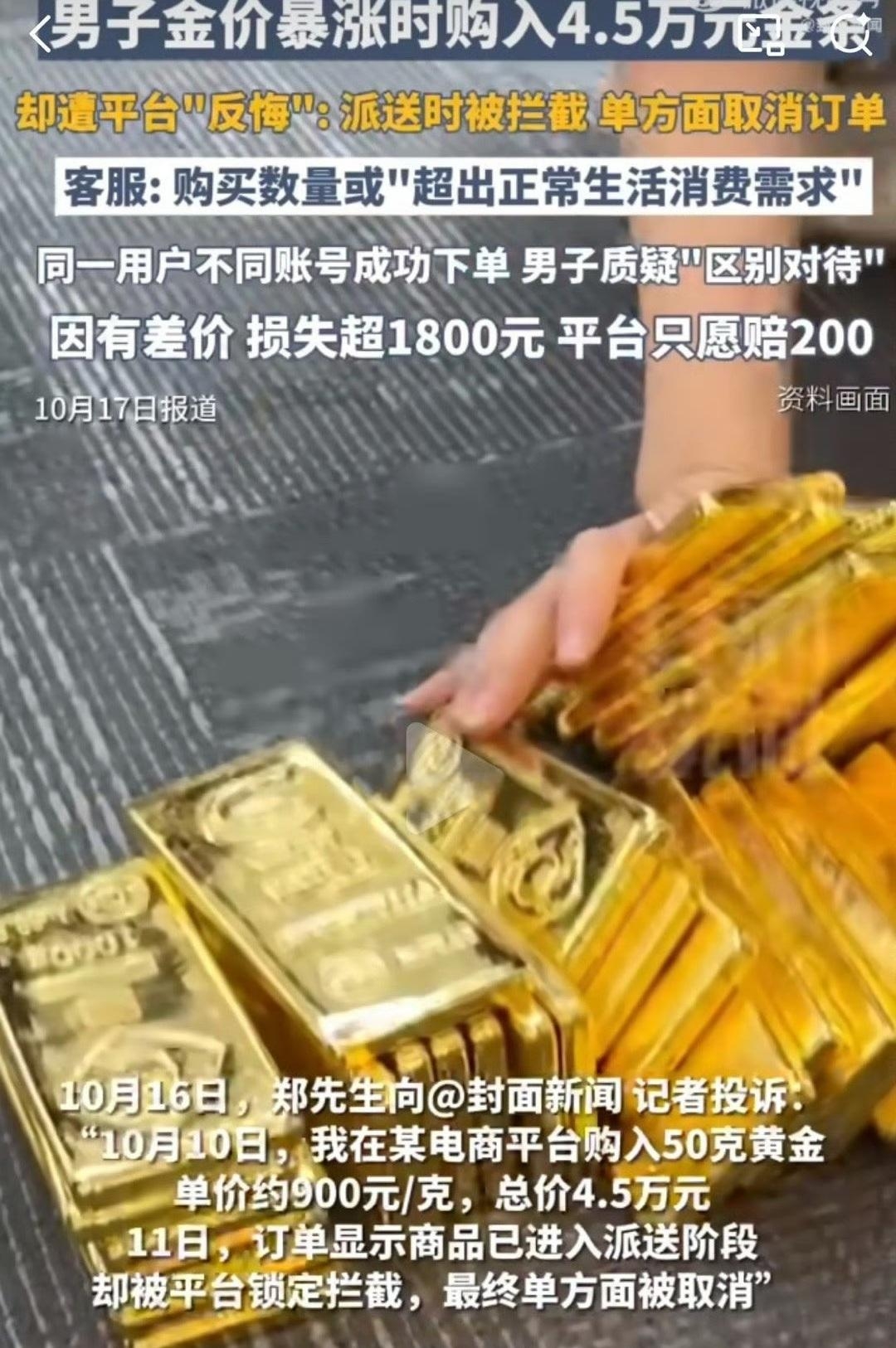 闻览焦点:金价飙升,本是商家与投资者共同关注的市场现象,却成了一面“照妖镜”,映照出某些电商平台在利益与契约精神之间的丑陋抉择。消费者郑先生价值4.5万元的黄金订单在派送途中被平台单方面拦截取消,甚至