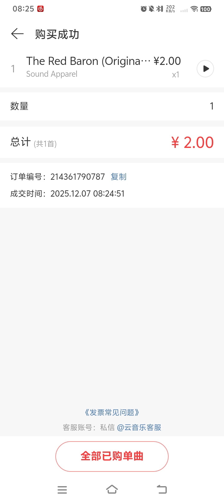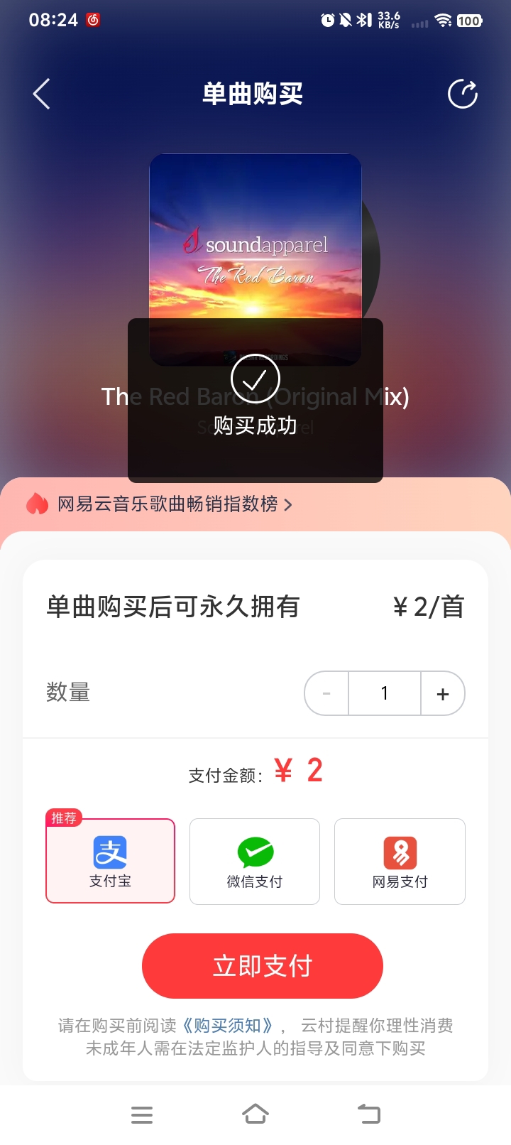 金刚拳的武术:网易云音乐的单曲购买成功The Red Baron,可永久播放及下载