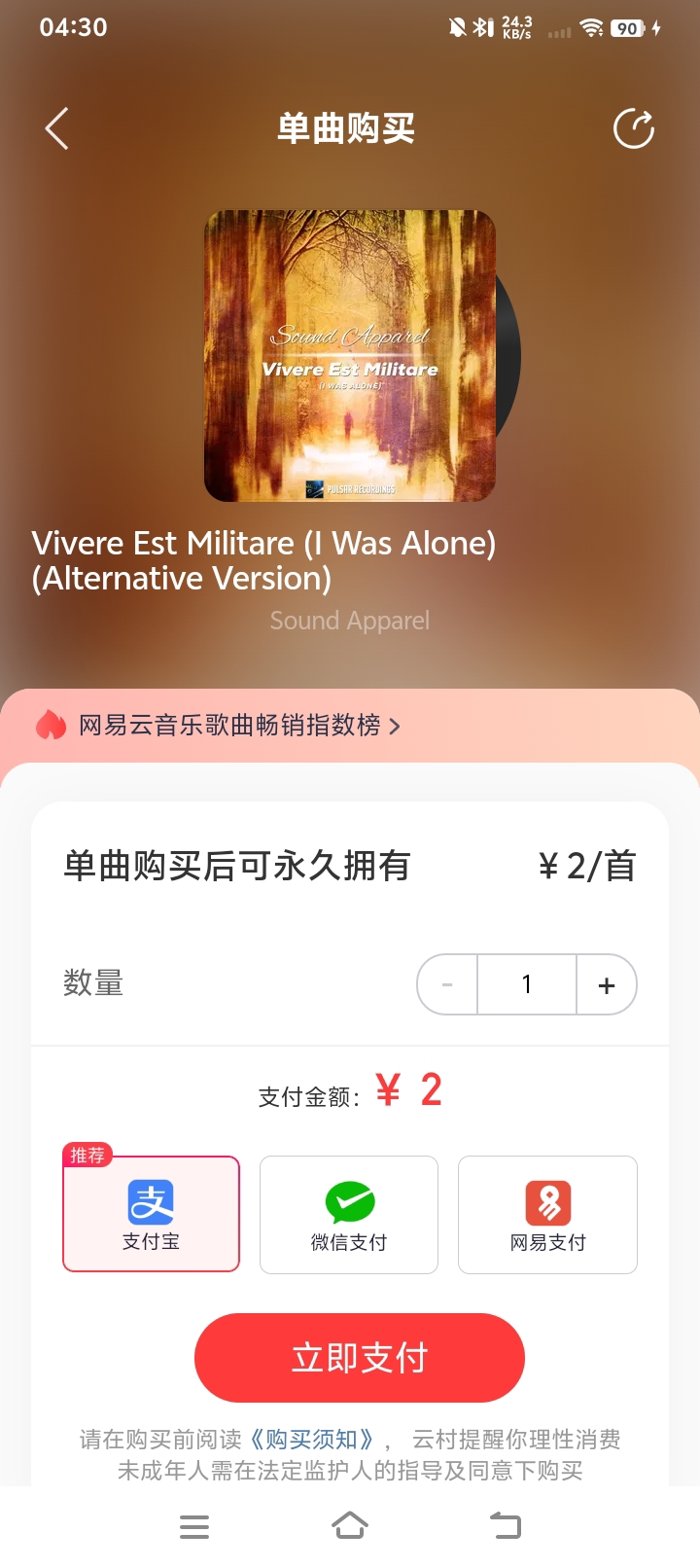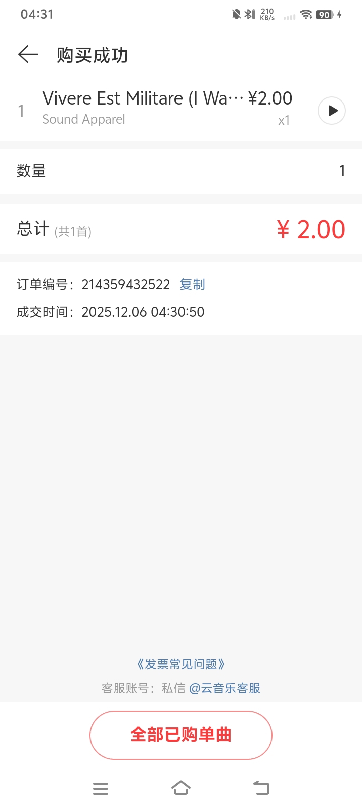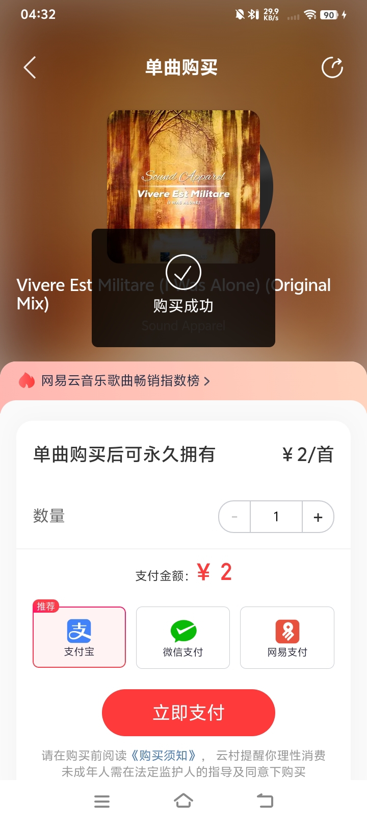 这孩子真猴:终于网易云的单曲购买成功的Vivere Est Militare,可以永久播放或下载