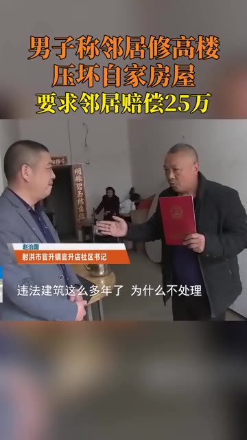 0次播放 | 00:12男子称邻居修高楼,压坏自家房屋,要求邻居赔偿25万